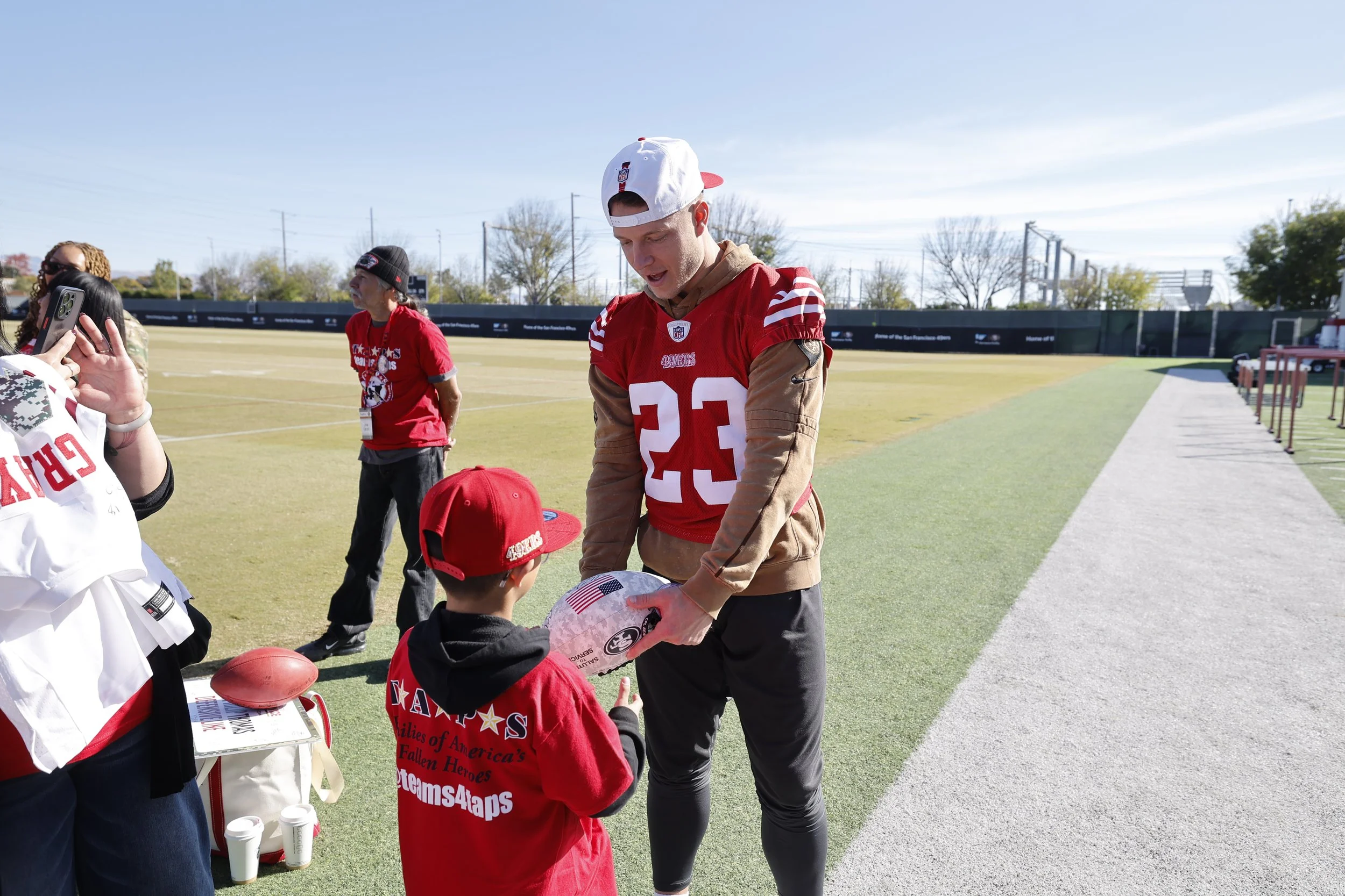 To kickoff the NFL’s Salute to Service initiative, the 49ers hosted military members and families for a behind-the-scenes practice visit experience. Military participants included the families of fallen heroes from nonprofit TAPS, a Navy veteran and two active-duty Marine servicewomen. Guests enjoyed breakfast in the 49ers Café where John Lynch welcomed the group before they headed out to the practice field. Once practice concluded, the military guests were ‘paired’ with position groups of players who welcomed the guests, shared their appreciation, and learned more of their stories. The families returned for the Salute to Service presented by U.S. Bank game, enjoying football festivities, including standing on the sidelines during player intros, the anthem and fly over. TAPS families were featured as the Second Half Fog Horn Energizers.