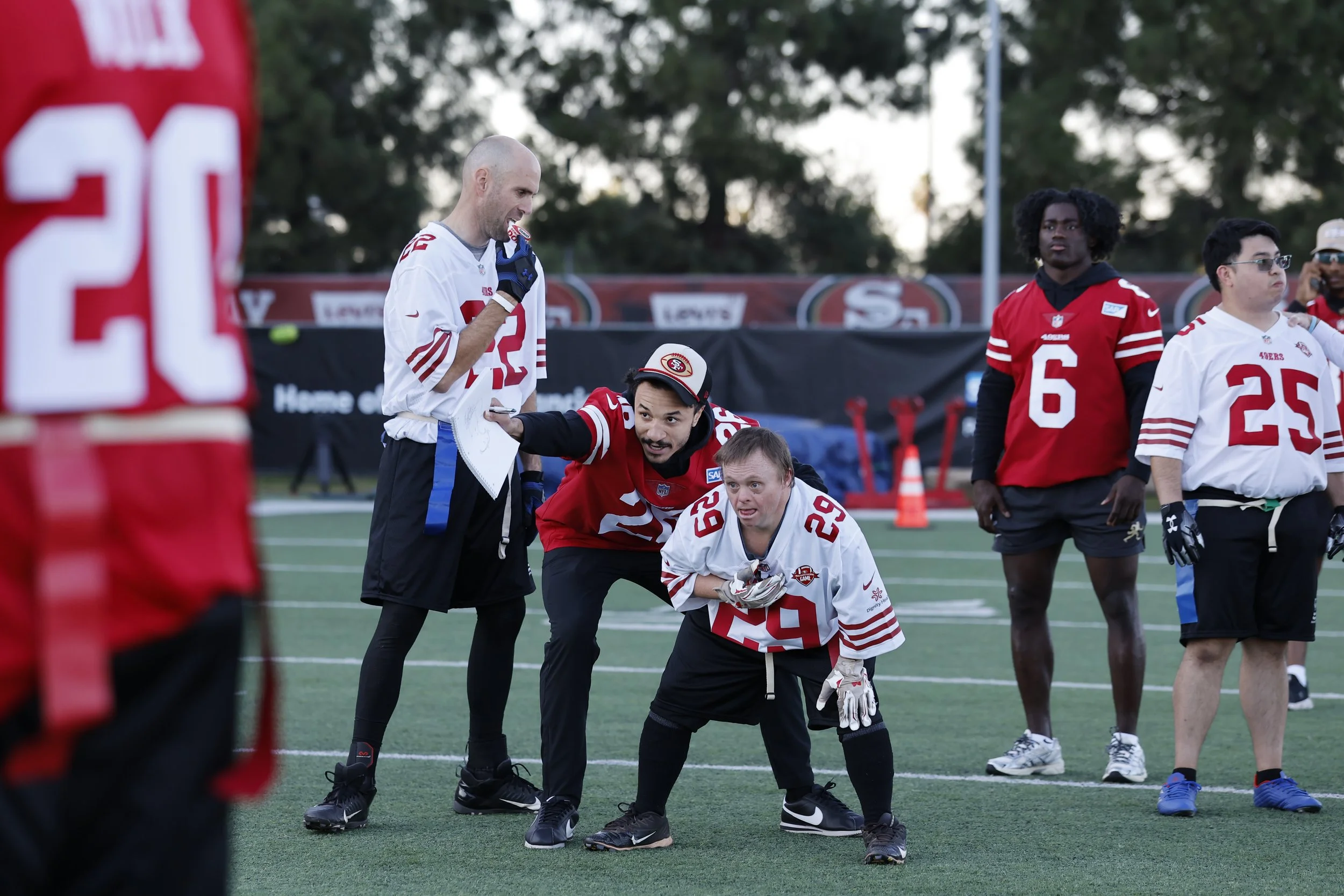 The 49ers hosted a Special Olympics flag football game presented by Dignity Health, creating an unforgettable experience for two Special Olympics unified teams at the SAP Performance Facility. The 49ers players joined the event, taking on roles as coaches and referees, offering guidance, encouragement, and even more positive energy.